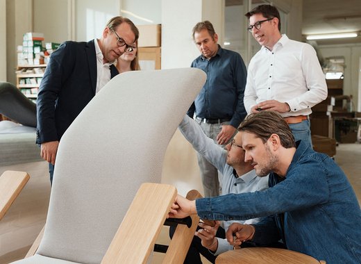 - Materialien: Gestell aus geölter Eiche mit Polsterstoff in der Farbe Sandgrau (0214) oder Gestell aus geöltem Nussbaum mit Polsterstoff in der Farbe Graphitgrau (0394)